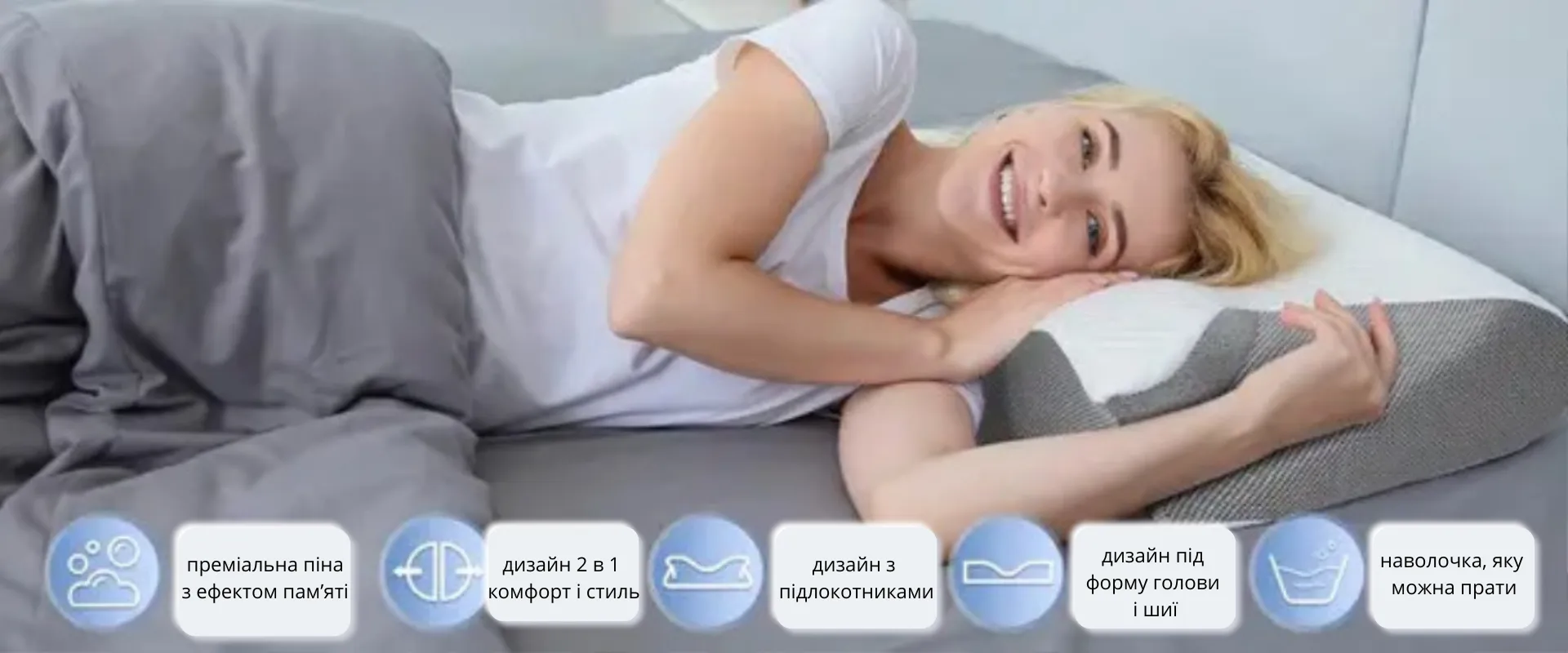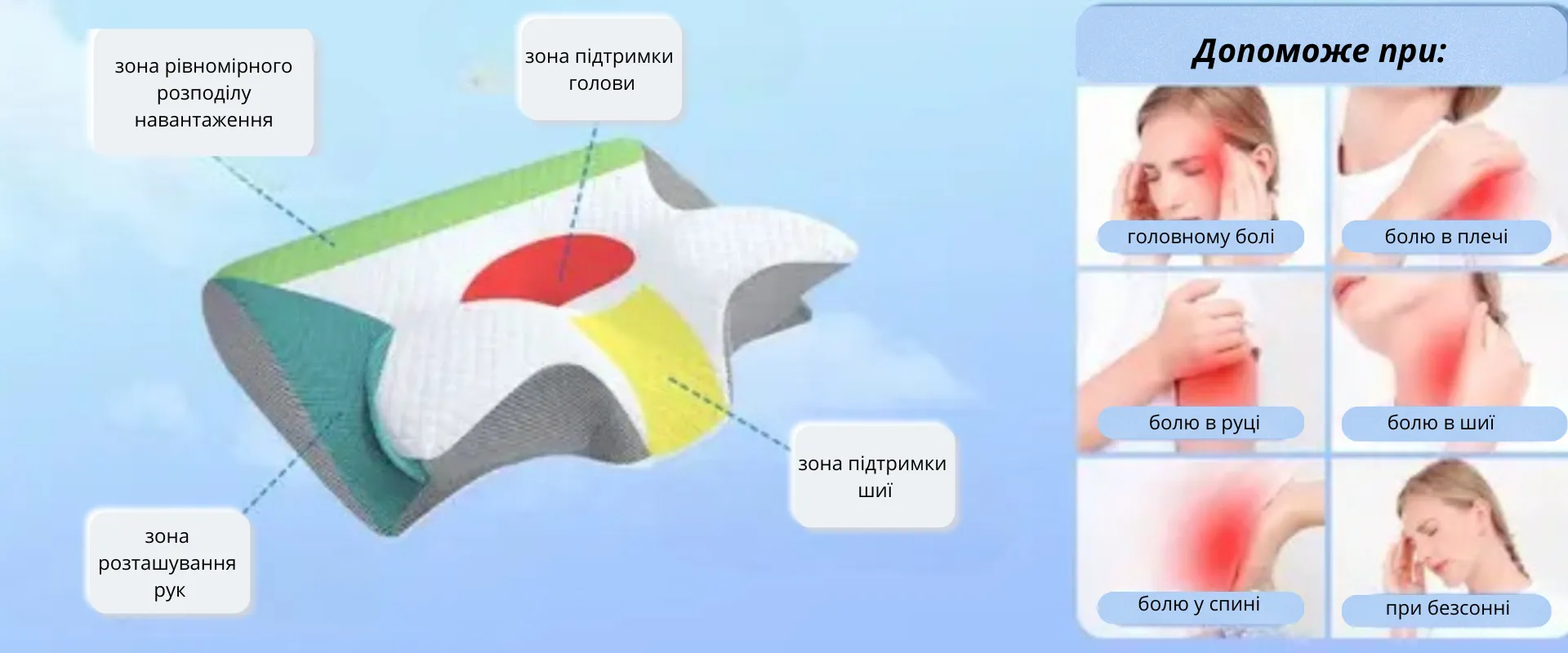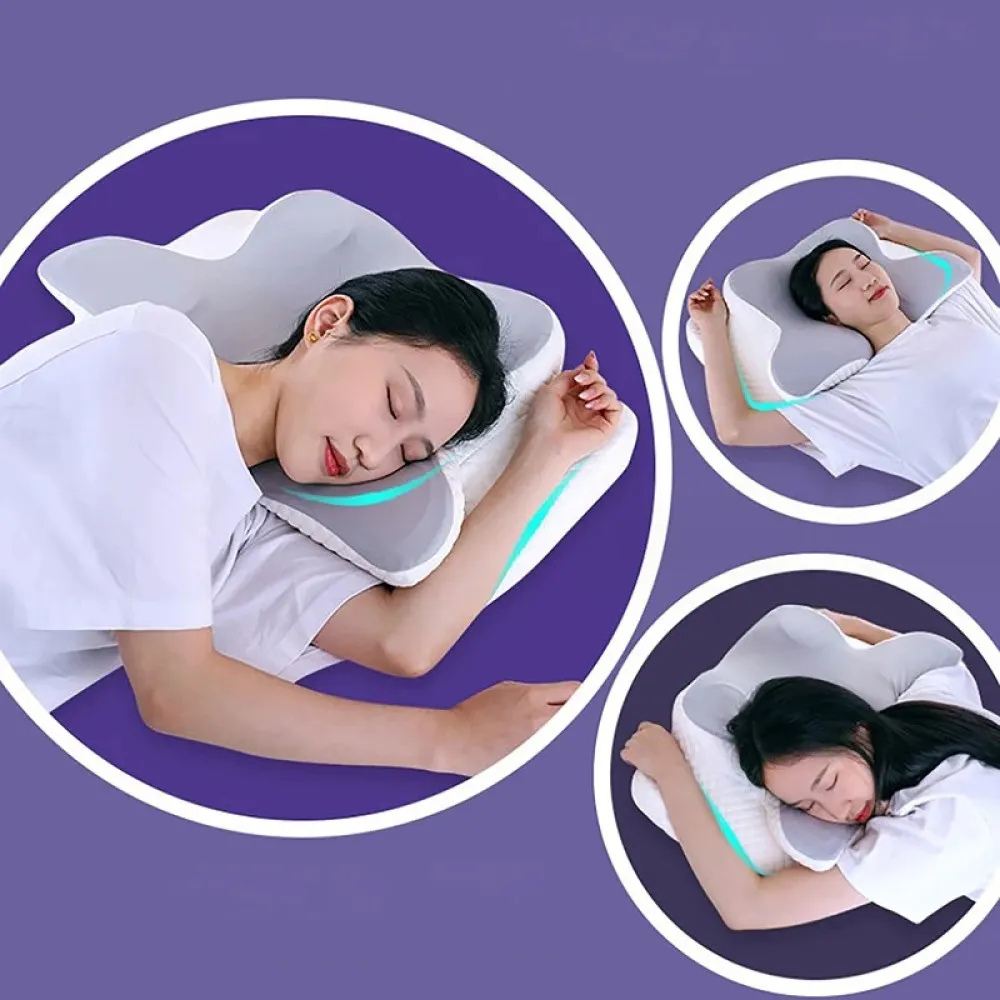 подушка поділена на зони, що нагадують форму метелика, де бокові частини зручні для рук у будь-якій позі, а центр забезпечує стабільну підтримку голови і шиї уві сні: